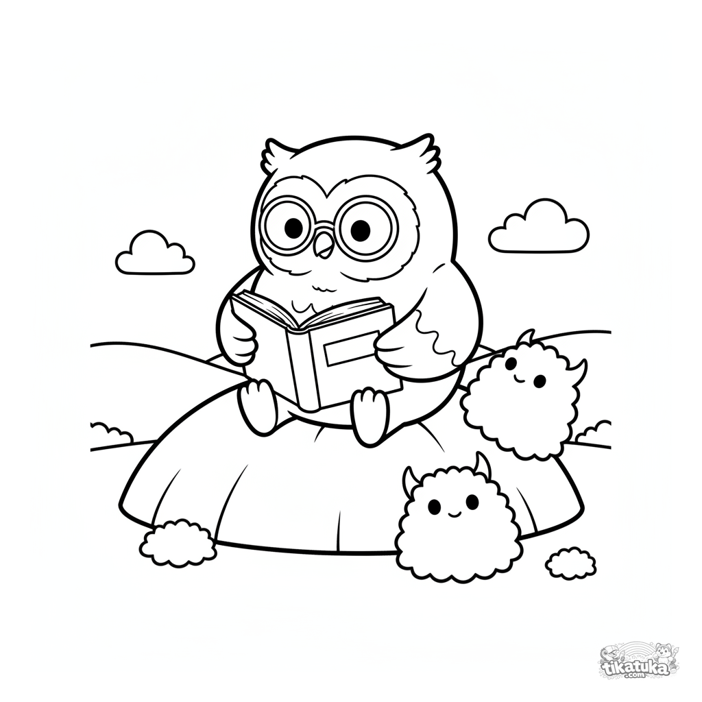 Página para colorear para niños: el lindo búho Oof lee un libro a amigables monstruos nube esponjosos en una suave colina. Estilo de marioneta suave, personajes amables.