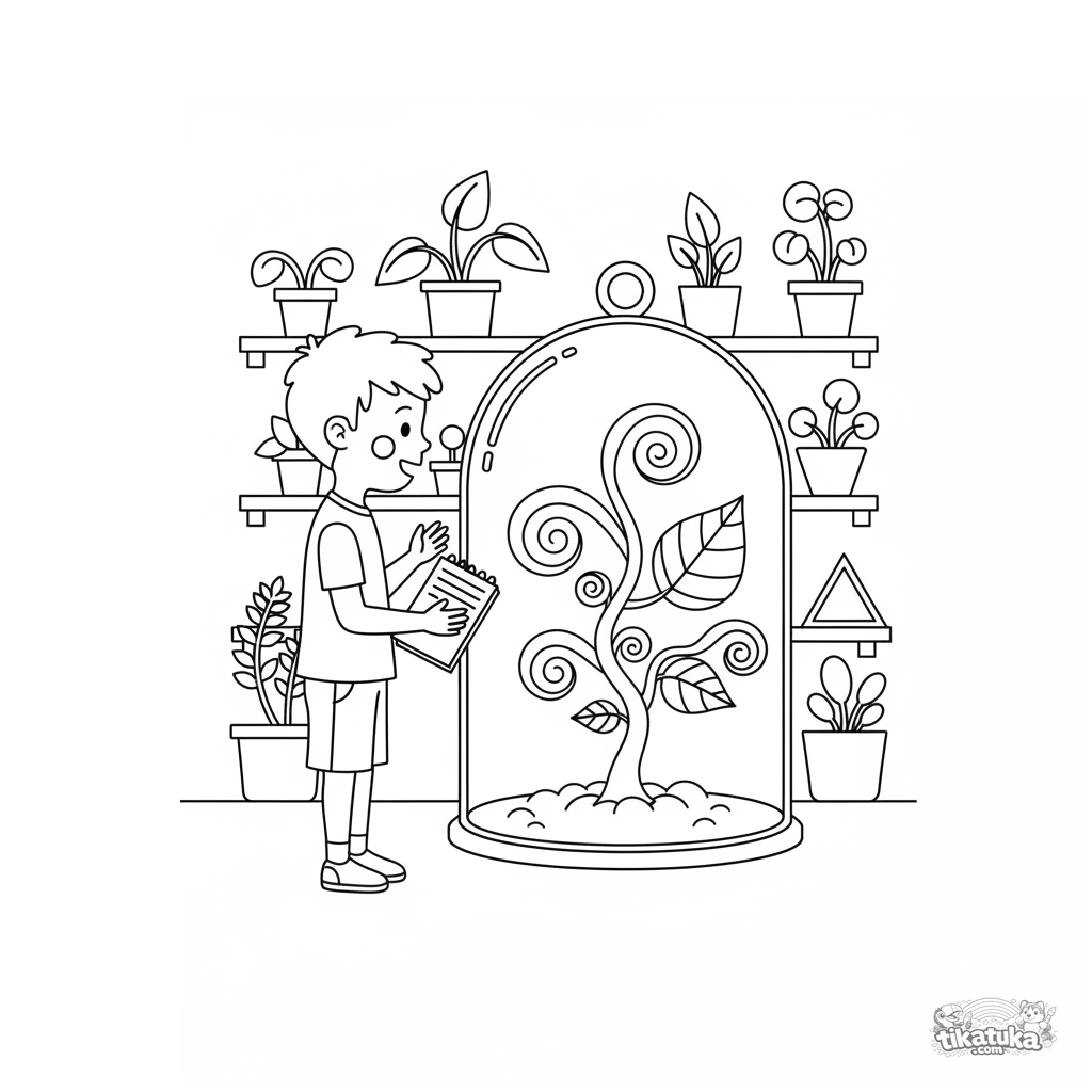 Página para colorear para niños de 7-9 años en estilo de recorte de papel: un niño estudia una planta extraña en un laboratorio secreto.