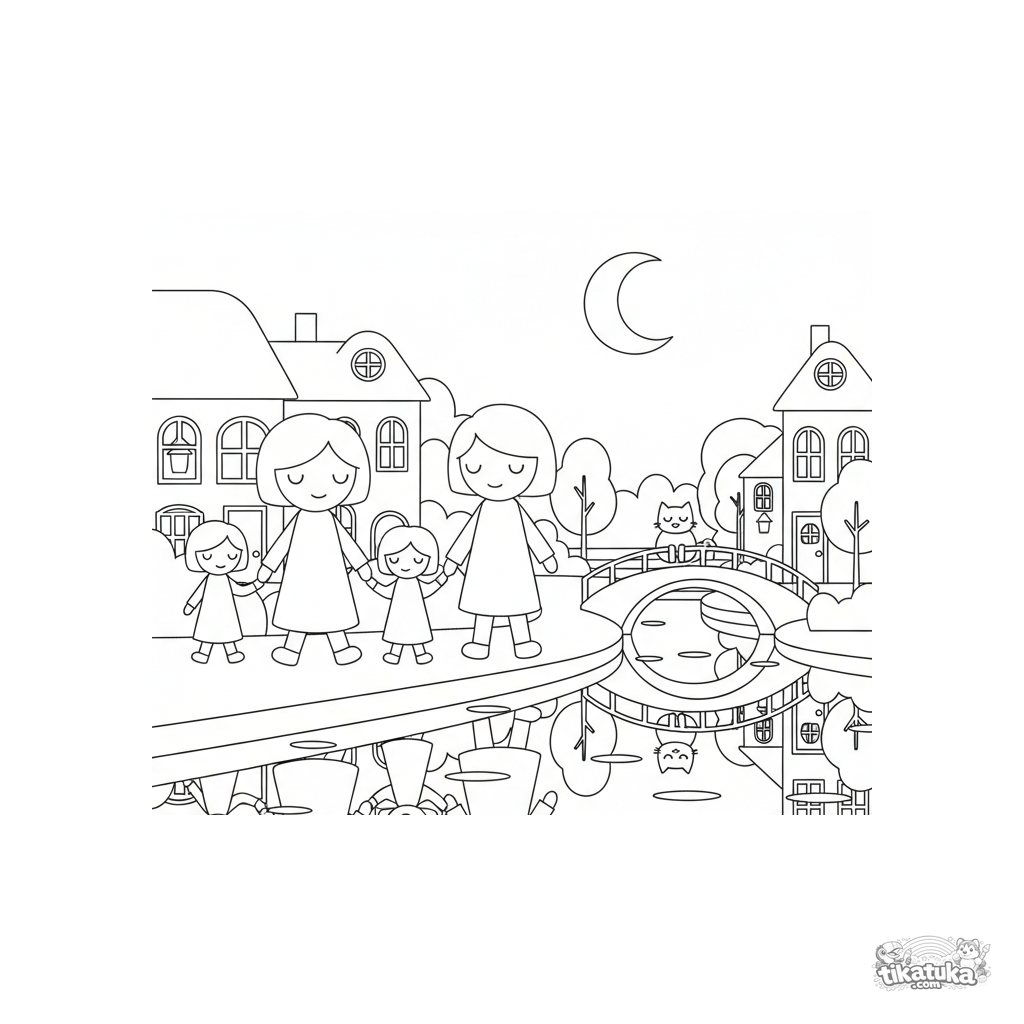 Página para colorear para niños de 4-6 años en estilo papel cortado: una familia pasea de noche por un canal con linternas brillantes. Una escena calmante con siluetas claras.