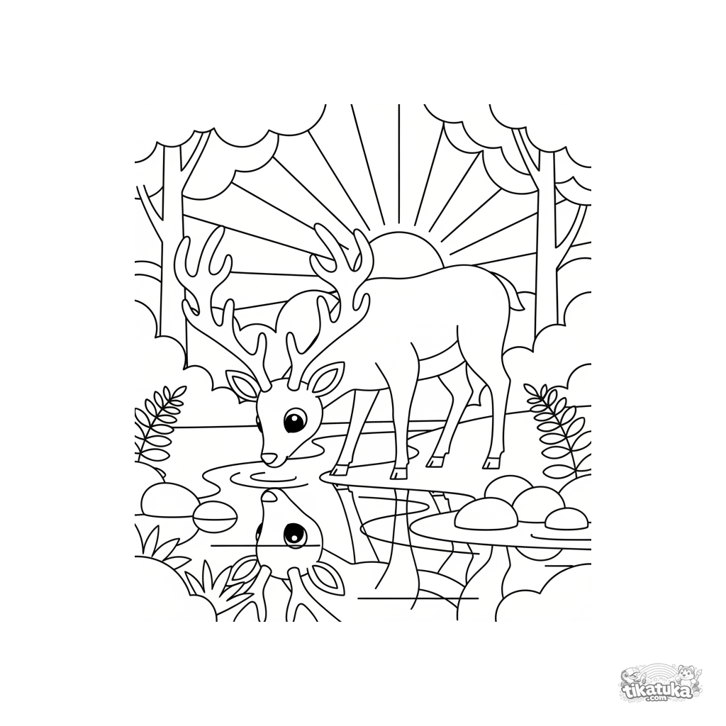Página para colorear para niños 4-6 en estilo papel cortado: un ciervo con astas ramificadas bebe de un arroyo. Siluetas gráficas, reflejo en el agua y rayos de sol estilizados.
