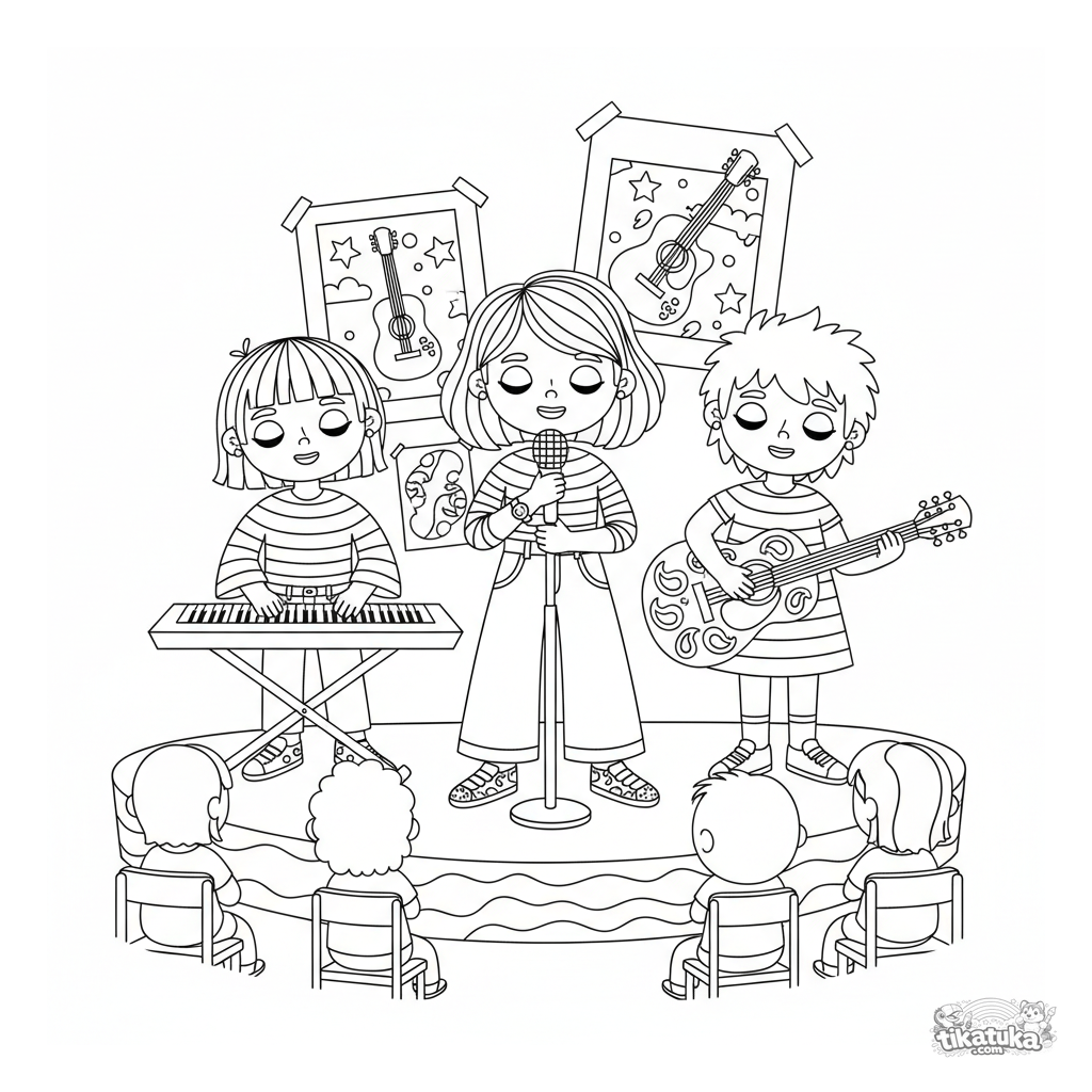 Página para colorear estilo papel cortado para niños de 7 a 12 años: una banda emo-lite tocando en un escenario pequeño de un club musical. Escena con siluetas detalladas.