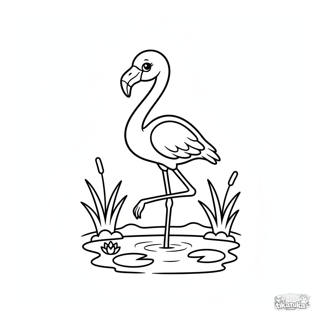 Página para colorear para niños: un flamenco grácil descansando en una pata al borde del estanque. Contornos claros en estilo de recorte de papel.