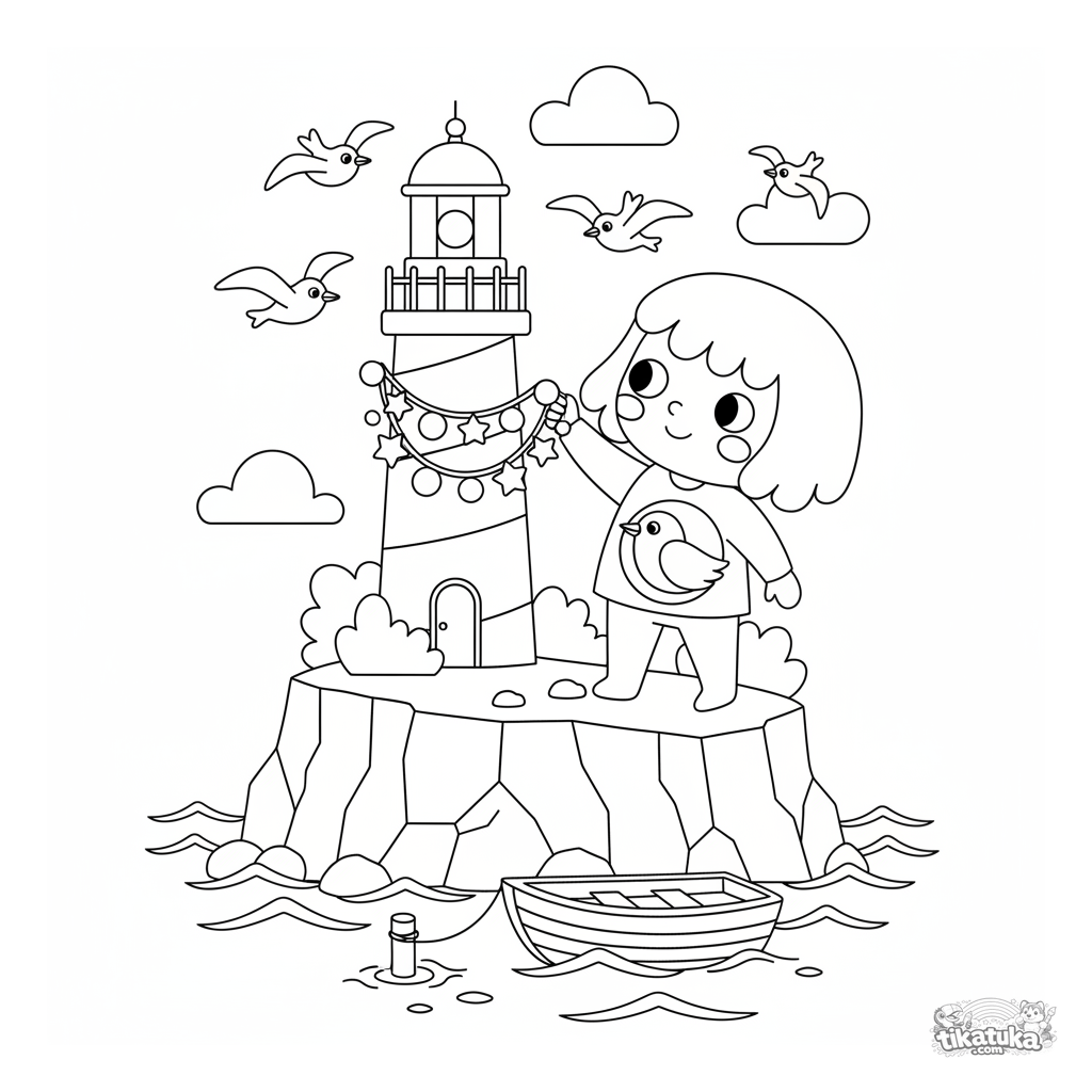 Página para colorear para niños de 4-6 años en estilo papel cortado: un guardián decora un faro a rayas en un acantilado. Siluetas claras y formas simples.