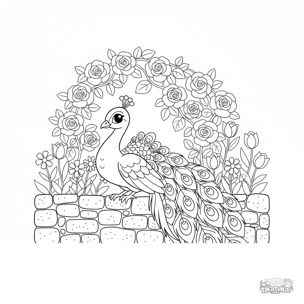 Página para colorear para 7-12 años: un pavo real estilo papel cortado descansa en un muro de piedra en un jardín floreciente.