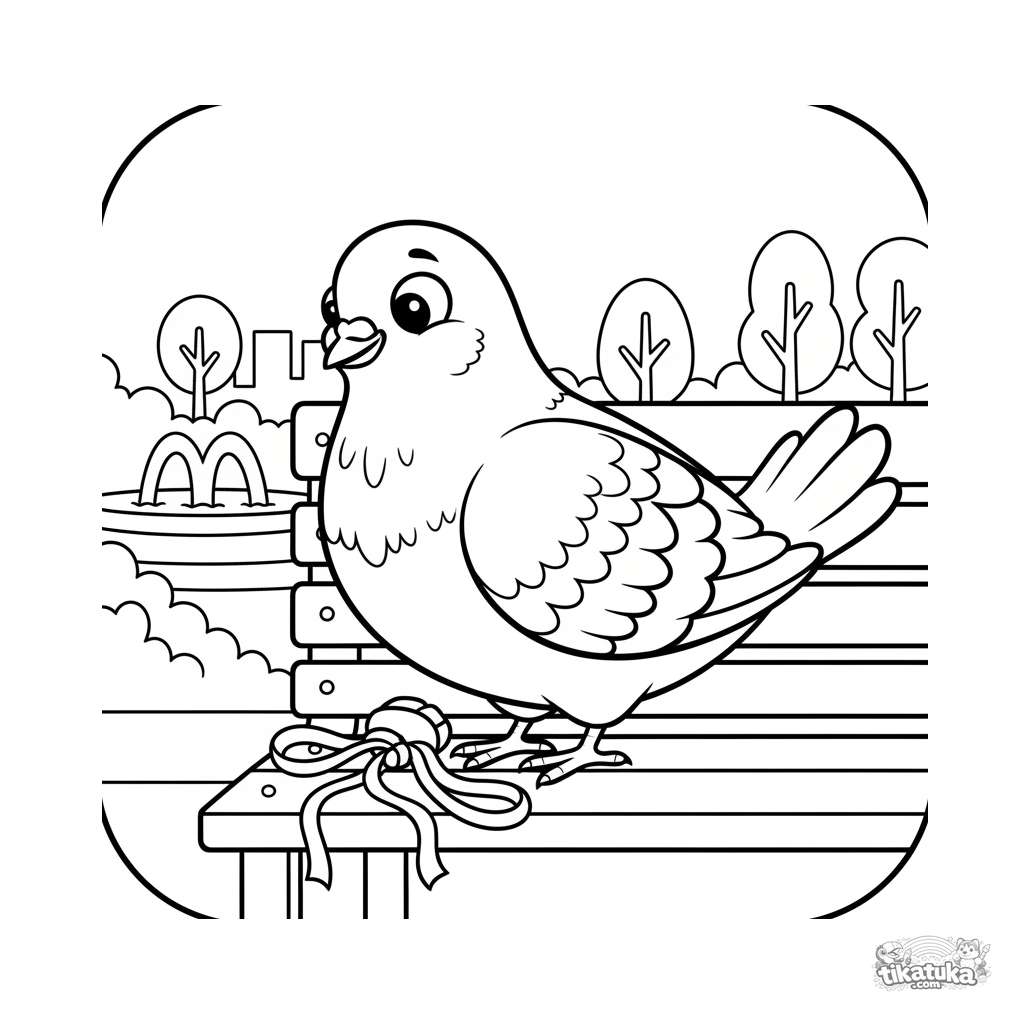 Página para colorear para niños: una paloma urbana colecciona cintas en un parque, en estilo de papel cortado. Para edades 4-7 años.
