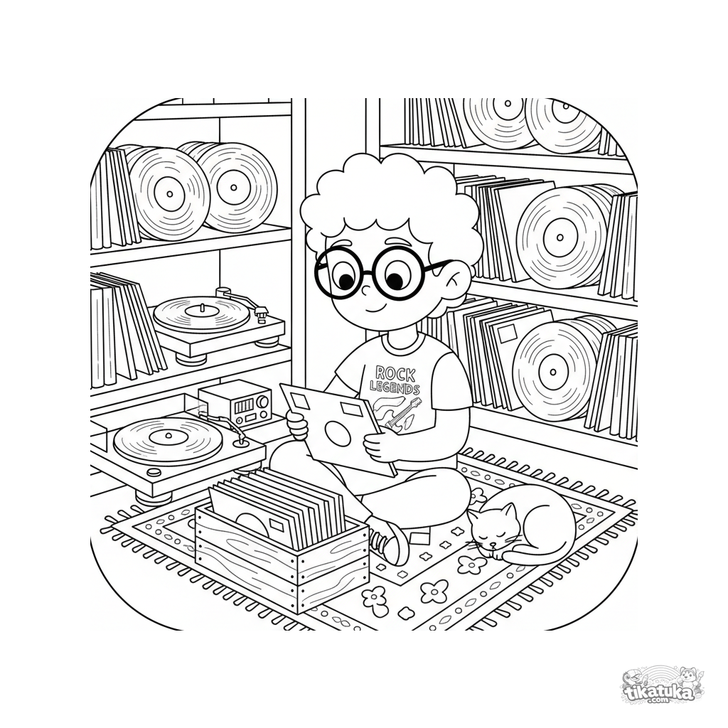 Página para colorear estilo papel cortado para niños de 7 a 12 años: coleccionista de vinilos examinando una funda de disco en un rincón de club musical. Escena cálida y detallada con gato.