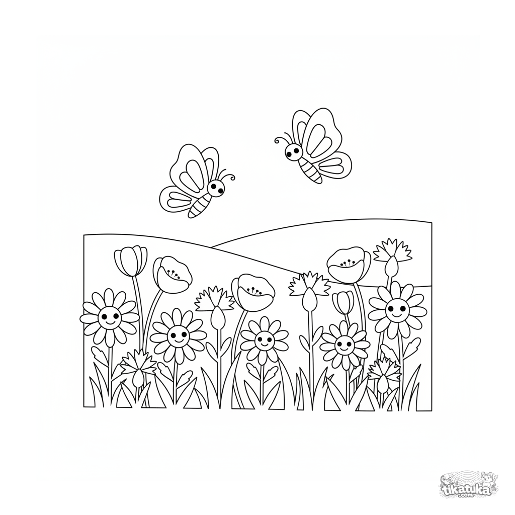 Página para colorear para 7-9 años en estilo de papel cortado: siluetas de margaritas, amapolas y acianos en una pradera con mariposas.