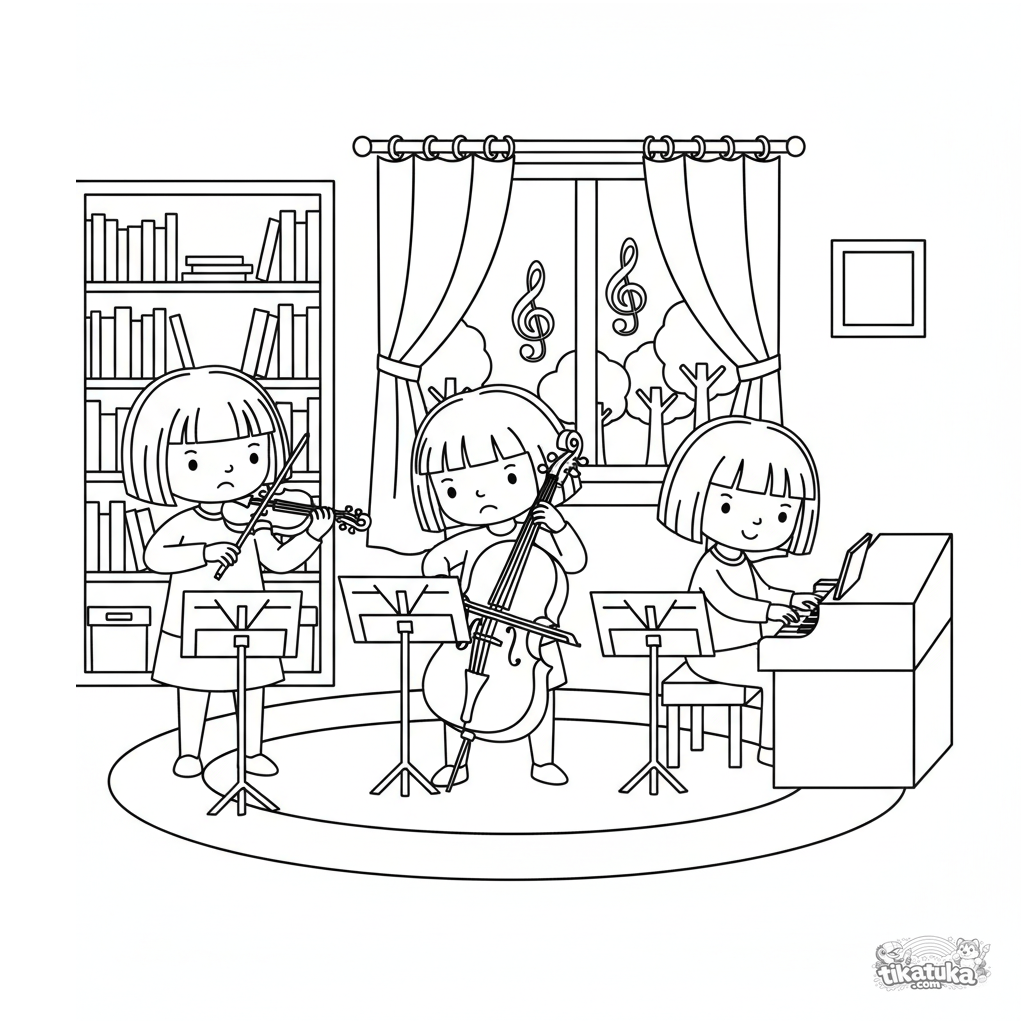 Página para colorear para niños 5-8: un trío de músicos en estilo de recorte de papel toca en una sala acogedora.