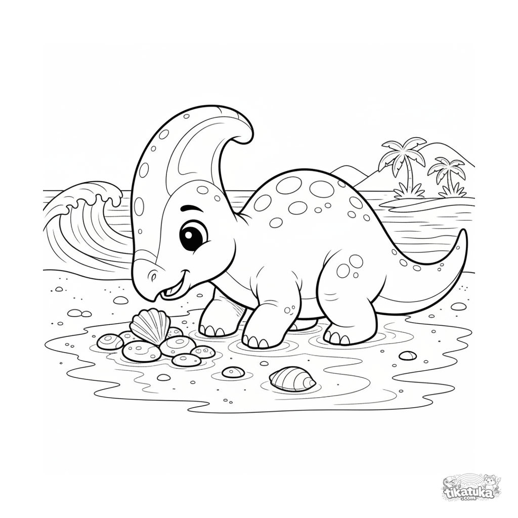 Página para colorear para niños 4-6: un parasaurolophus explora un charco de marea en una playa oceánica antigua. Dinosaurio cuerpo completo con amplios márgenes blancos.