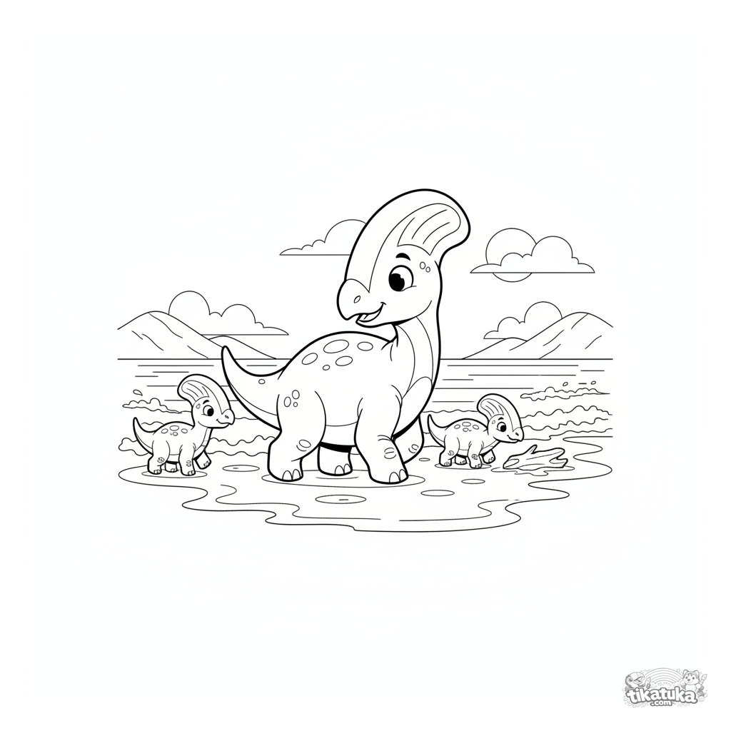 Página para colorear para niños de 4-6 años: una familia de dinosaurios parasaurolophus caminando por la playa de arena de un océano antiguo.