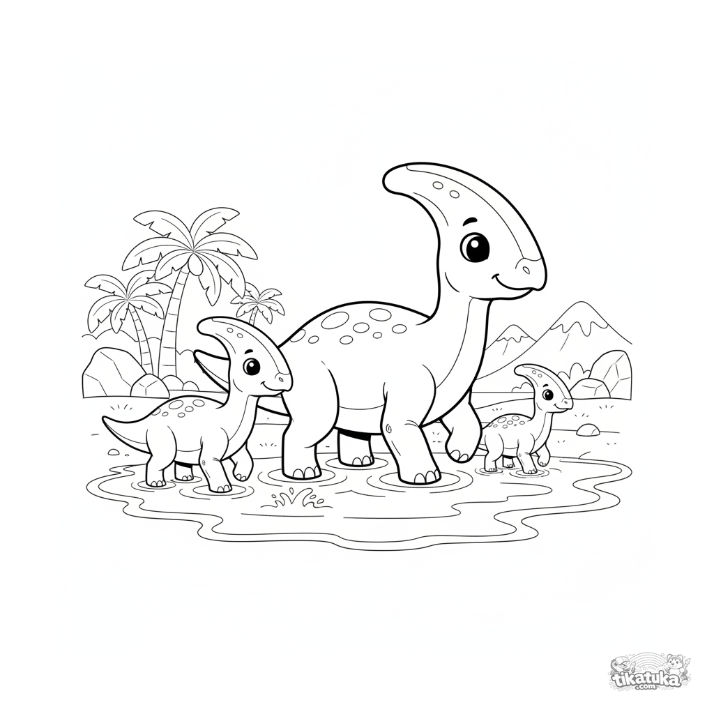 Página para colorear para niños de 4-6 años: una familia de dinosaurios parasaurolofus pasea por la orilla del agua en una playa arenosa oceánica antigua. Detalle moderado, formas claras.