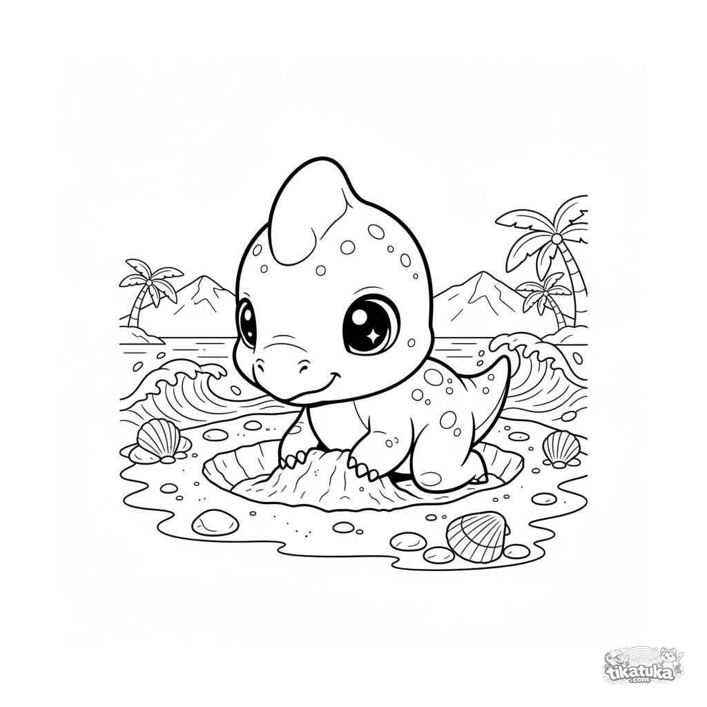 Página para colorear para niños 4-6: un bebé parasaurolophus cava un nido en la arena de un océano antiguo. Escena tierna con conchas y olas suaves.