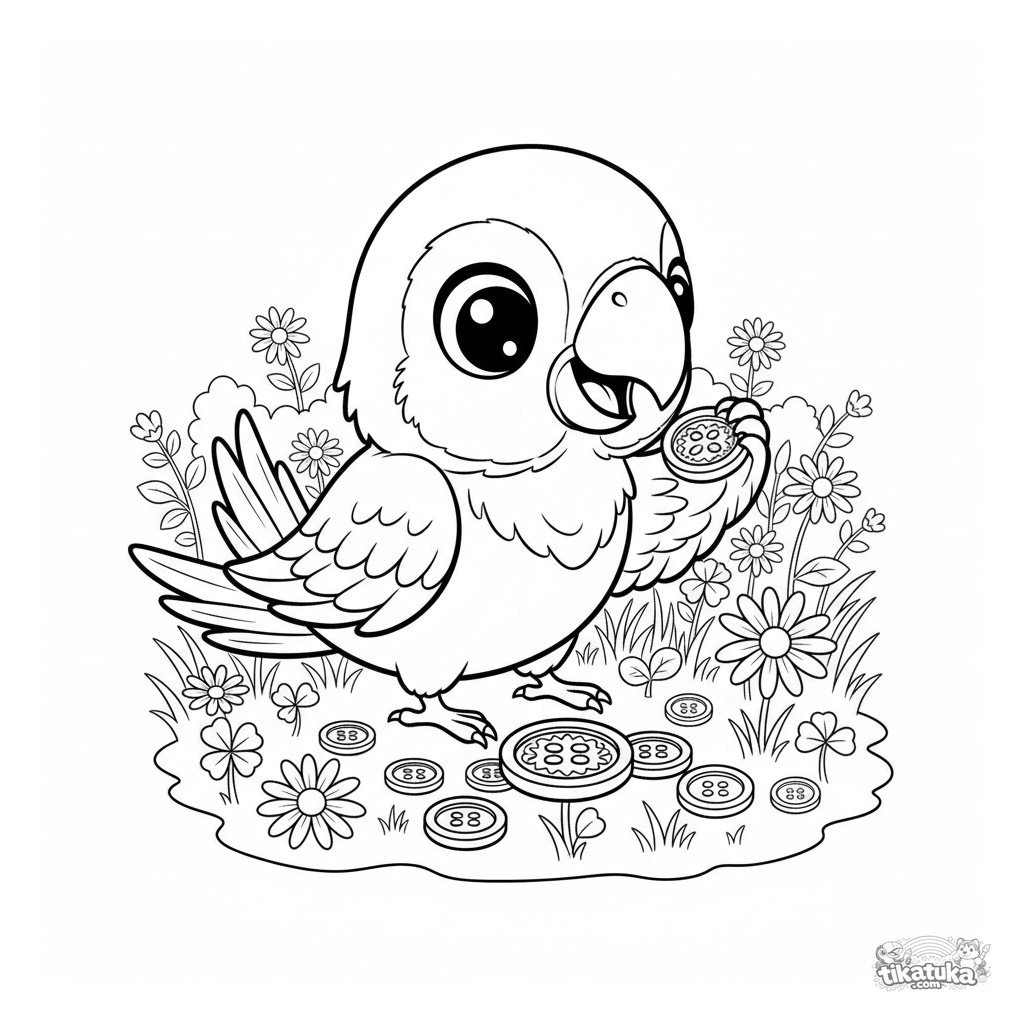 Página para colorear para niños: un loro alegre en un prado florido recoge botones brillantes. Escena colorida y divertida con detalles para colorear.