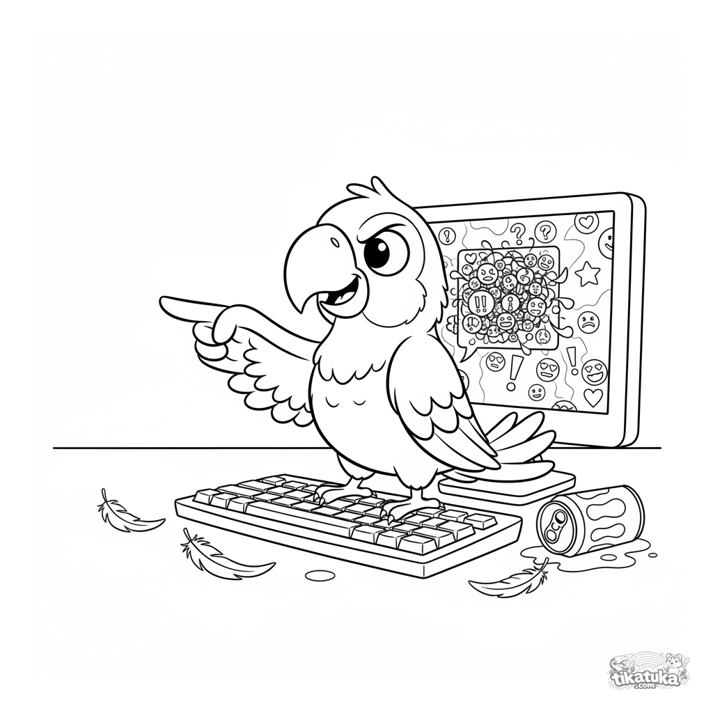 Página para colorear para niños 7-12: un loro dramático señala una ventana de chat caótica en un monitor. Escena de reacción divertida en estilo retro.
