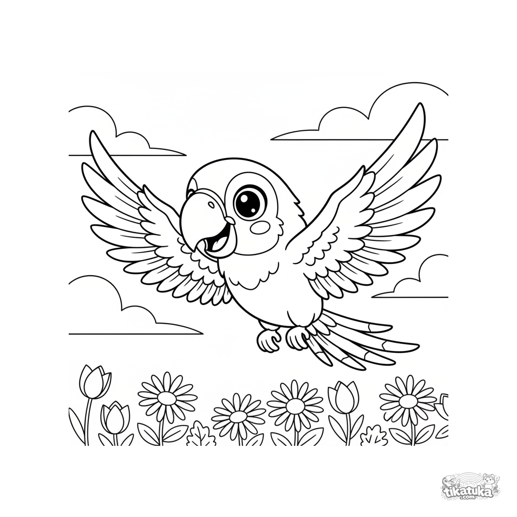 Página para colorear para niños: un loro feliz vuela sobre un prado primaveral. Estilo chibi con cabeza grande y ojos expresivos.