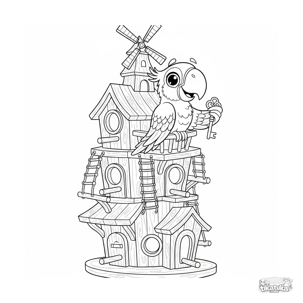 Página para colorear compleja para niños mayores de 10 a 12 años: un loro vibrante asomándose desde el balcón de un caprichoso castillo-casa de pájaros de varias plantas.