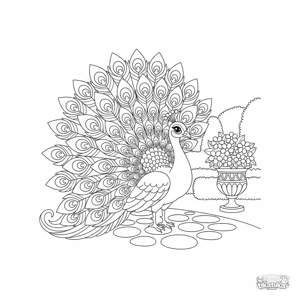 Página para colorear para niños mayores: un majestuoso pavo real despliega su cola en un jardín. Escena detallada con camino de piedra y setos.
