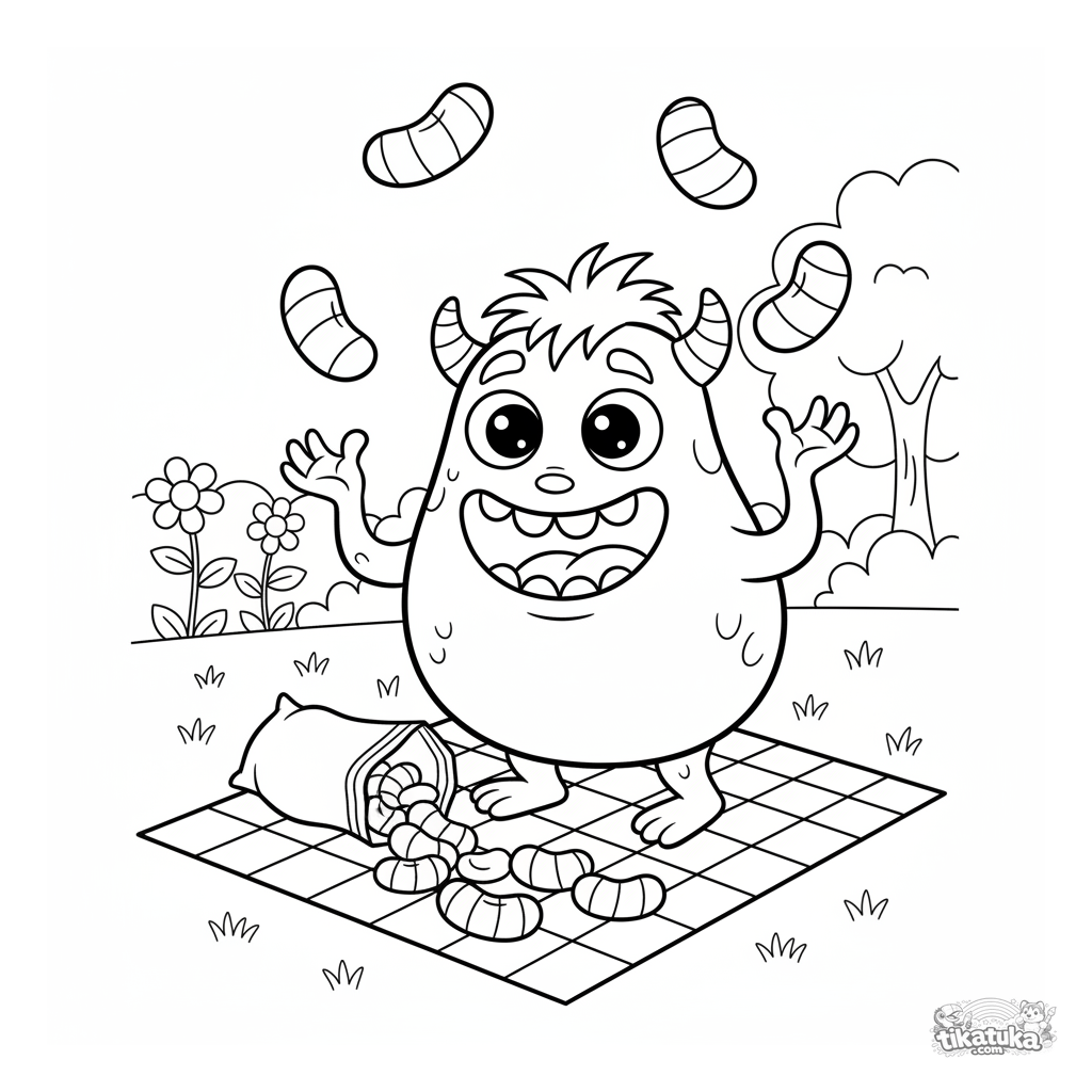 Página para colorear para 7-9 años: un monstruo alegre en forma de pera hace malabares con golosinas gigantes en un picnic. Escena dinámica.
