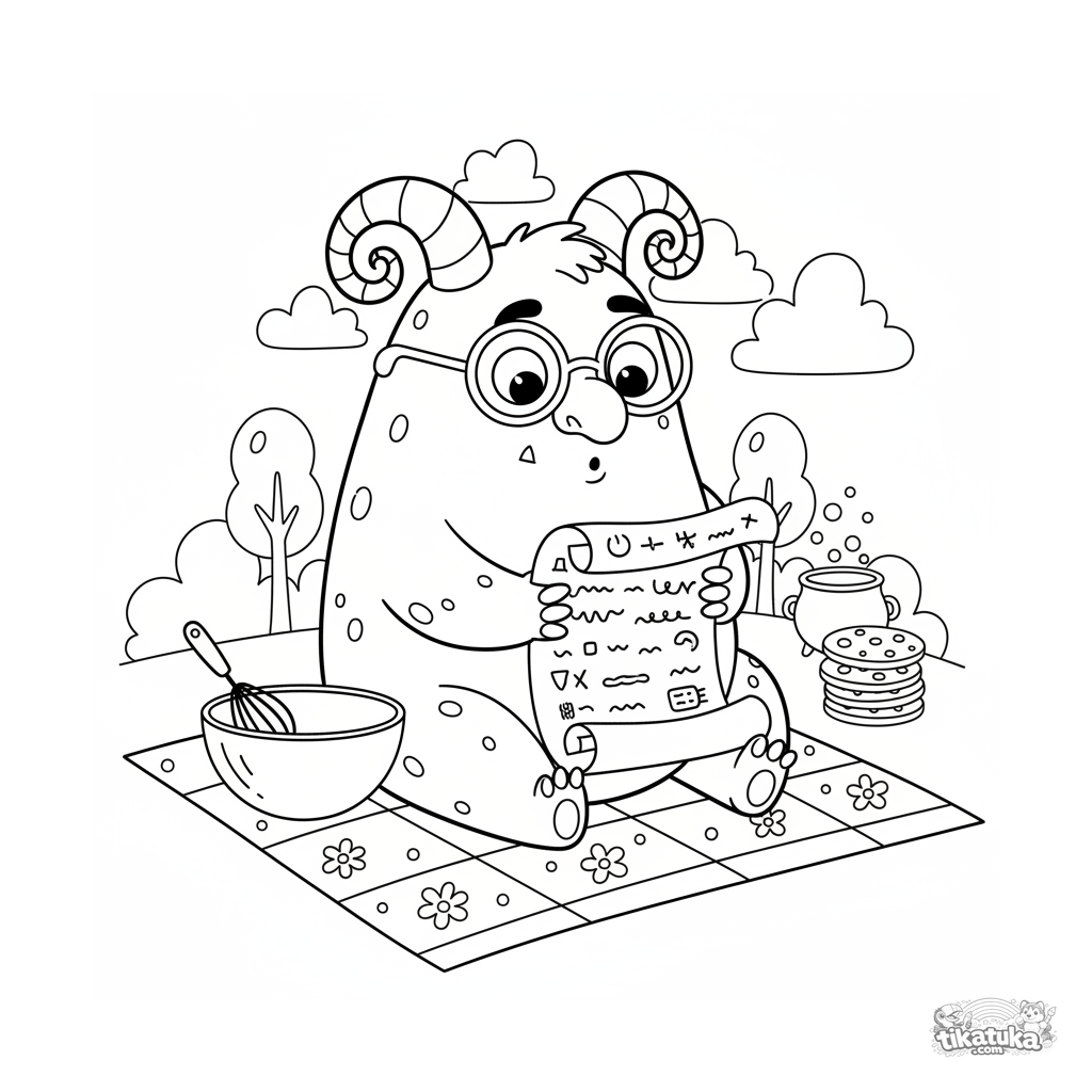 Página para colorear para niños 4-6 años: un monstruo en forma de pera con gafas se sienta en un picnic, leyendo atentamente un gran libro de recetas de dulces monstruosos. Escena linda y educativa.