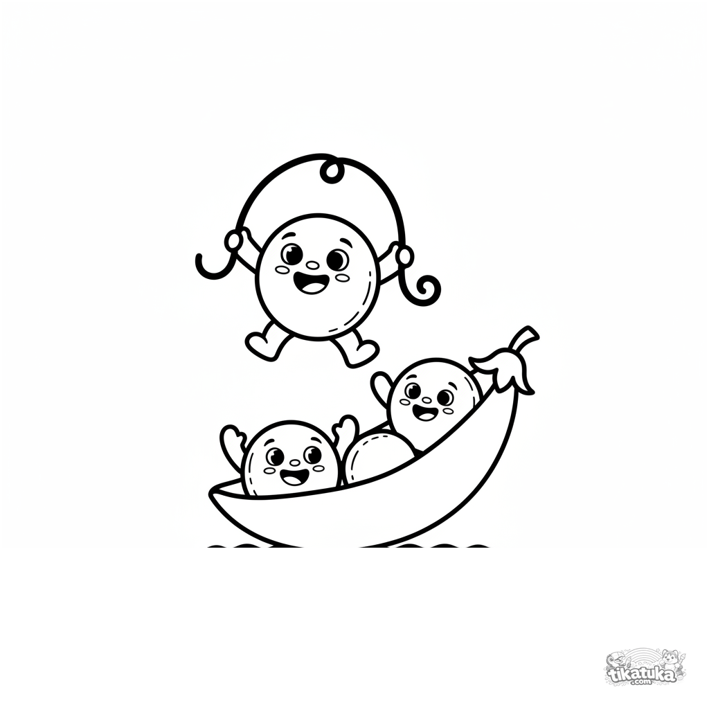 Página simple para colorear para niños pequeños: guisantes alegres en una vaina saltan a la cuerda. Formas redondeadas como de peluche, áreas grandes.