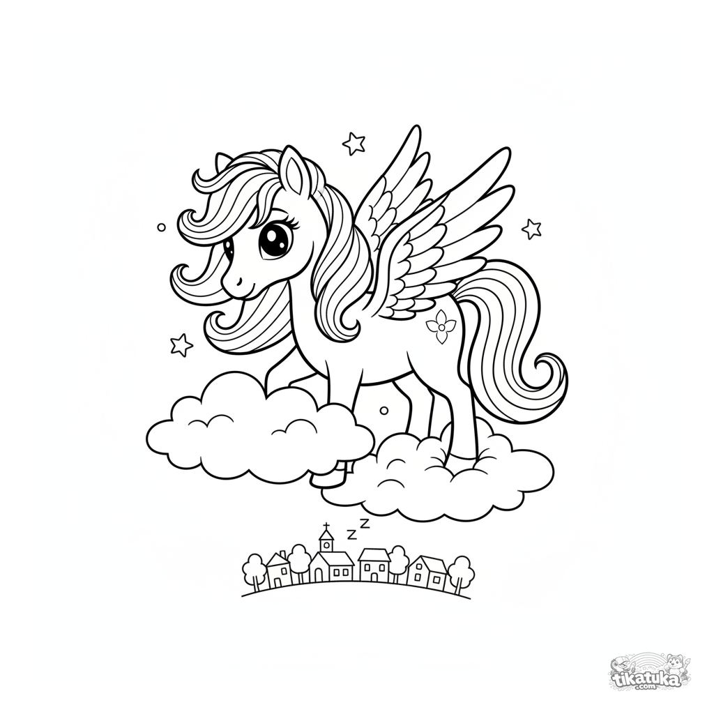 Página para colorear para niñas: un mágico poni pegaso con crin arcoíris pace en una nube esponjosa sobre un pueblo dormido. Para niños de 3 a 6 años.