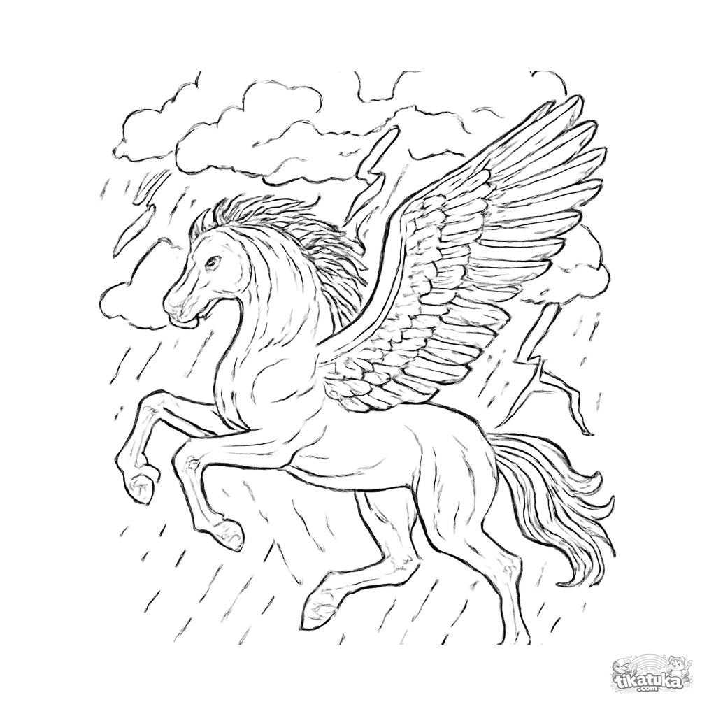 Página para colorear para niños. Pegaso negro galopando entre nubes de tormenta con rayos, alas extendidas en vuelo dinámico. Descarga gratis.