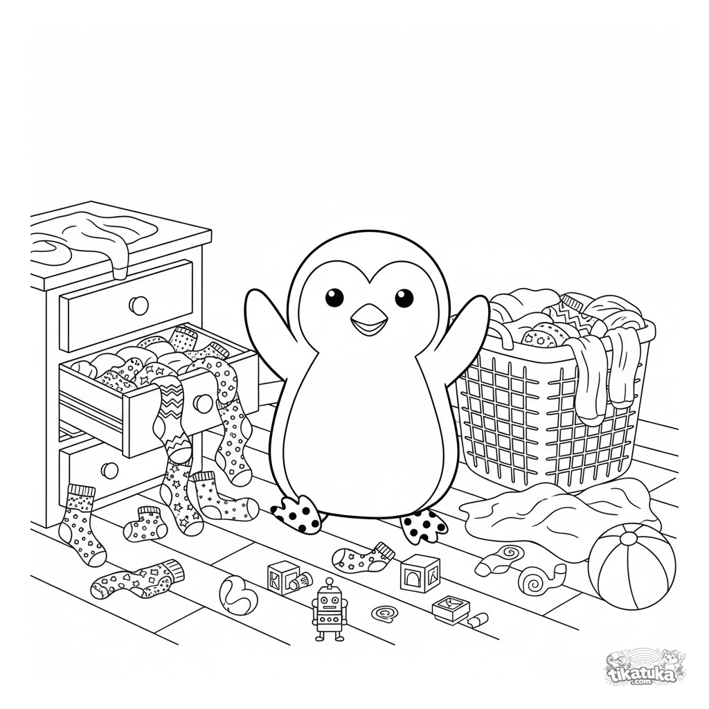 Página para colorear para niños de 7 a 12 años: un pingüino alegre celebra la victoria con calcetines desparejados en medio de una habitación con ropa esparcida. Escena divertida y reconocible.