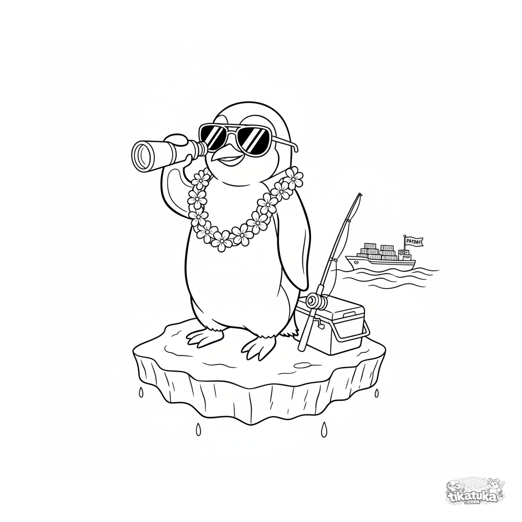Página para colorear para niños de 10-12 años: un pingüino genial con gafas de sol y lei en un iceberg con prismáticos, buscando un barco con bandera 'DÍA DE PAGO'. Escena absurda y detallada.