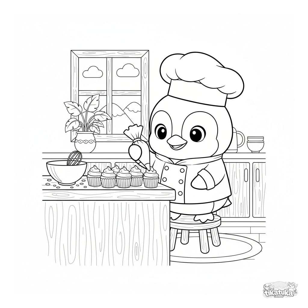 Página para colorear para niños 4-6: el pingüino de peluche chef Marcel hornea magdalenas en una cocina acogedora. Líneas simples, personaje lindo.