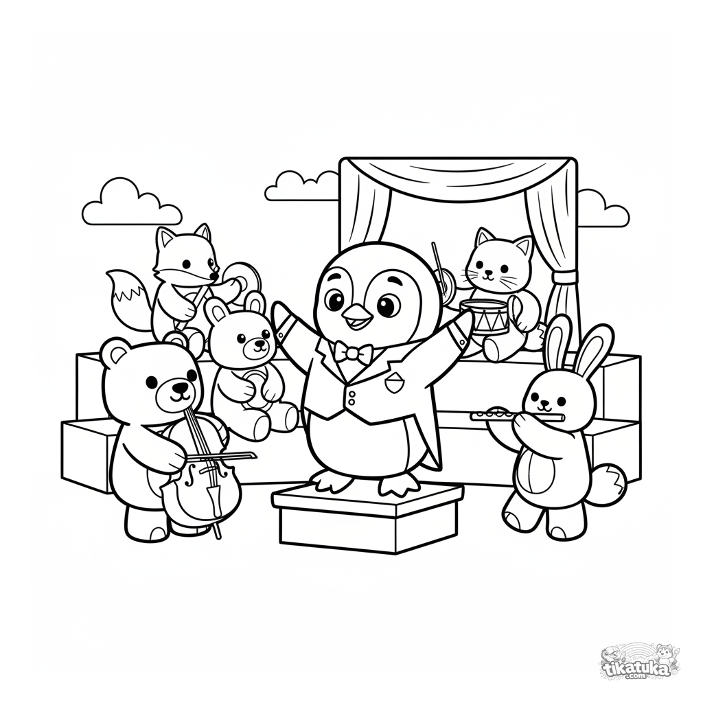 Página para colorear para niños: el pingüino Marcel como director de una orquesta de juguete. Escena divertida en estilo juguete de madera.