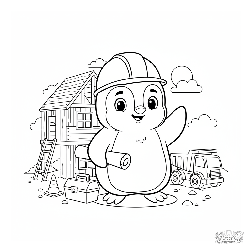 Página para colorear para niños 4-6: el pingüino Marcel con casco supervisando la construcción de una casa de juegos. Estilo de mascota de peluche tierno.