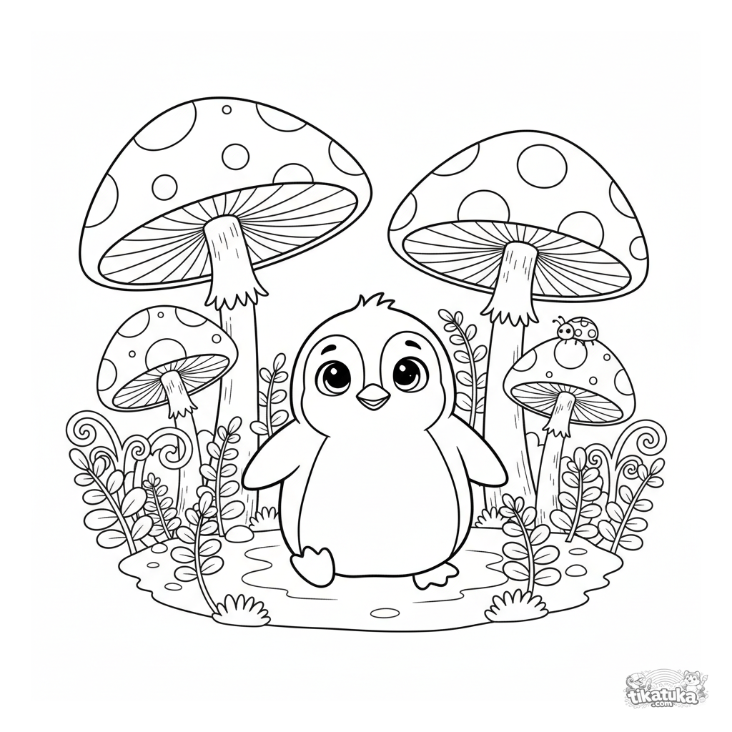 Página para colorear para niños: el pingüino Marcel explora un bosque mágico con hongos gigantes. Personaje lindo en estilo juguete escandinavo.