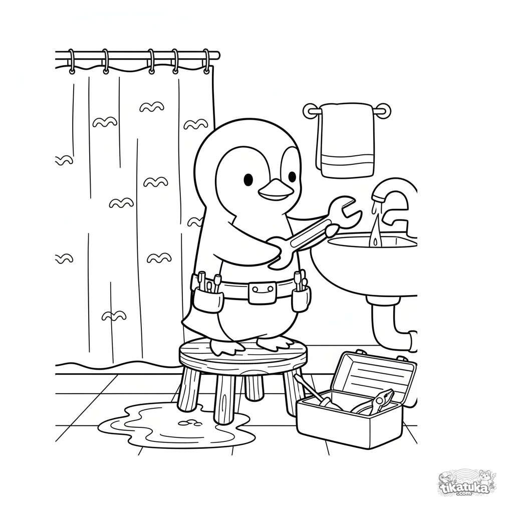Página para colorear para niños 4-6: el pingüino Marcel trabaja como fontanero arreglando un grifo que gotea. Herramientas simples, escena linda.