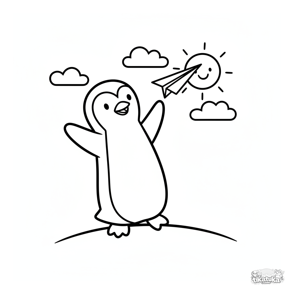 Página simple para colorear para niños pequeños 2-3: el pingüino Marcel lanzando un avión de papel. Formas grandes, pocos detalles, márgenes amplios.