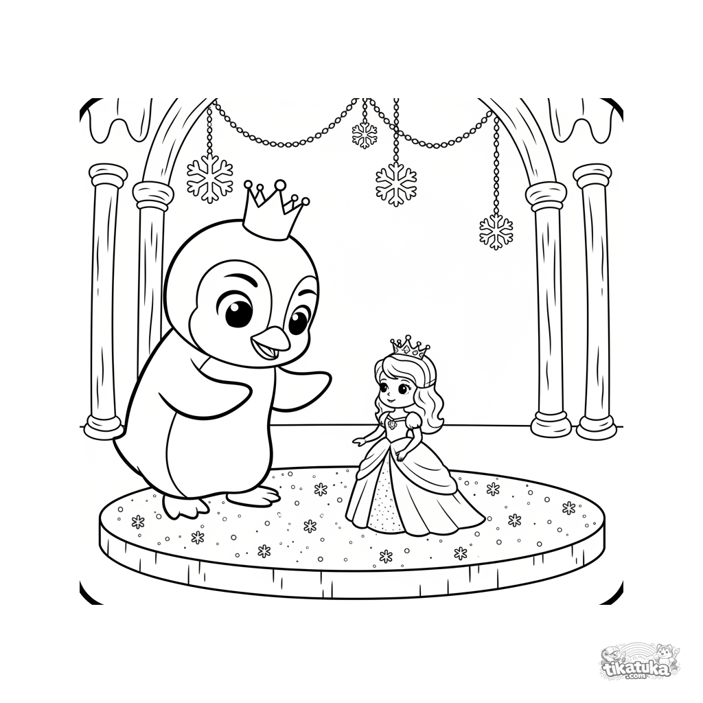 Página para colorear para niñas 4-6: el pingüino Marcel invitando a bailar a una princesa de hielo en un palacio de cristal. Estilo de marioneta suave.