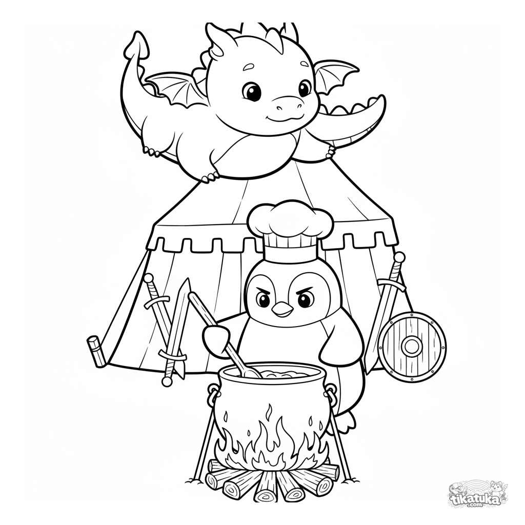 Página para colorear para niños 4-6: el pingüino Marcel cocina comida en un gran caldero en un campamento de entrenamiento de caballeros. Formas geométricas estilo juguete de madera.