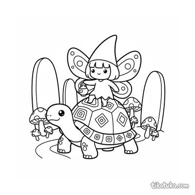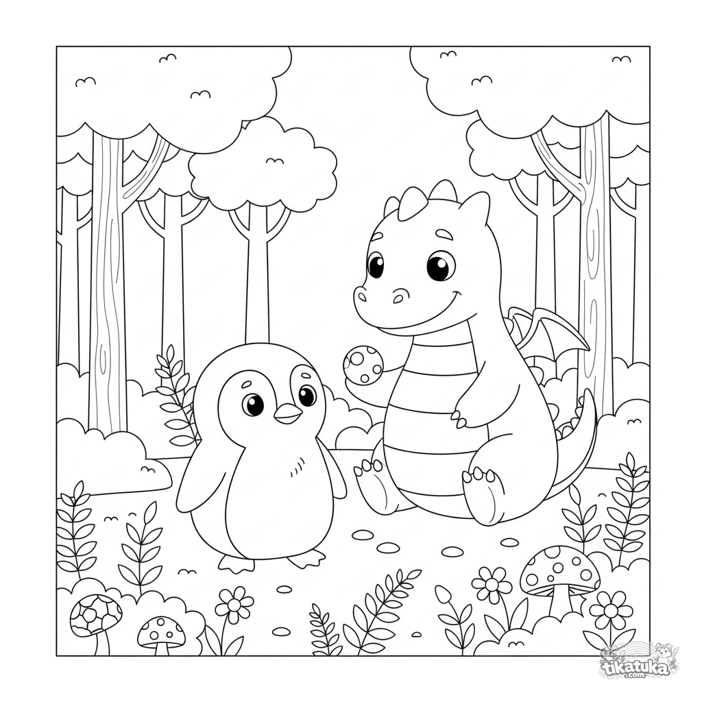 Página para colorear para niños 4-6: el pingüino Marcel conoce a un dragón de peluche amigable en un claro del bosque. Encuentro lindo, detalles naturales simples.