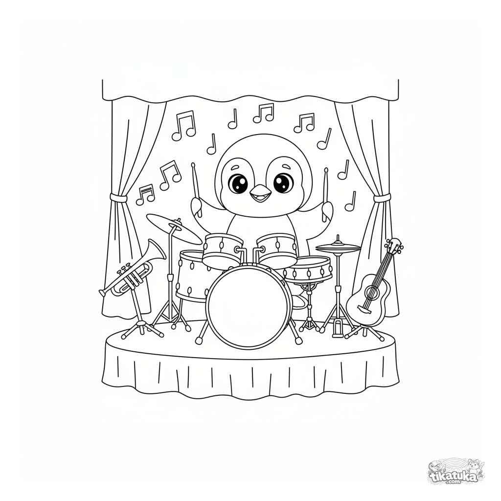 Página para colorear para niños 4-6: el pingüino Marcel tocando la batería en el escenario de una banda pequeña. Escena expresiva en estilo de marioneta suave.