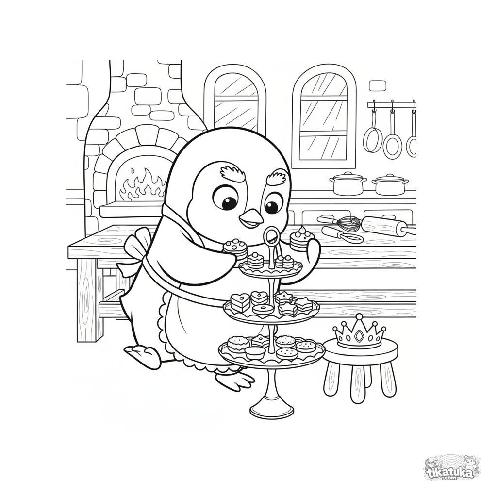 Página para colorear para niñas 4-6: el pingüino chef Marcel arregla dulces para una fiesta de té real en una cocina de castillo. Estilo de marioneta suave.