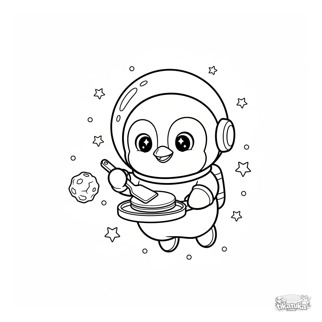 Página para colorear del Chef Pingüino Marcel cocinando en el espacio exterior. Para niños de 4 a 6 años. Escena divertida en estilo mascota de peluche.