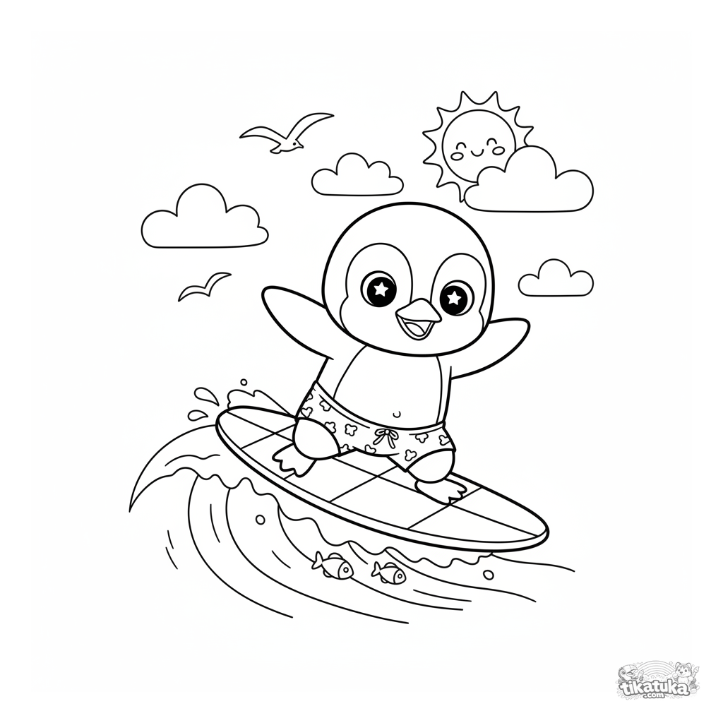 Página para colorear para niños 4-6: el pingüino Marcel monta hábilmente una tabla de surf en una ola del océano. Pose dinámica, fondo simple.