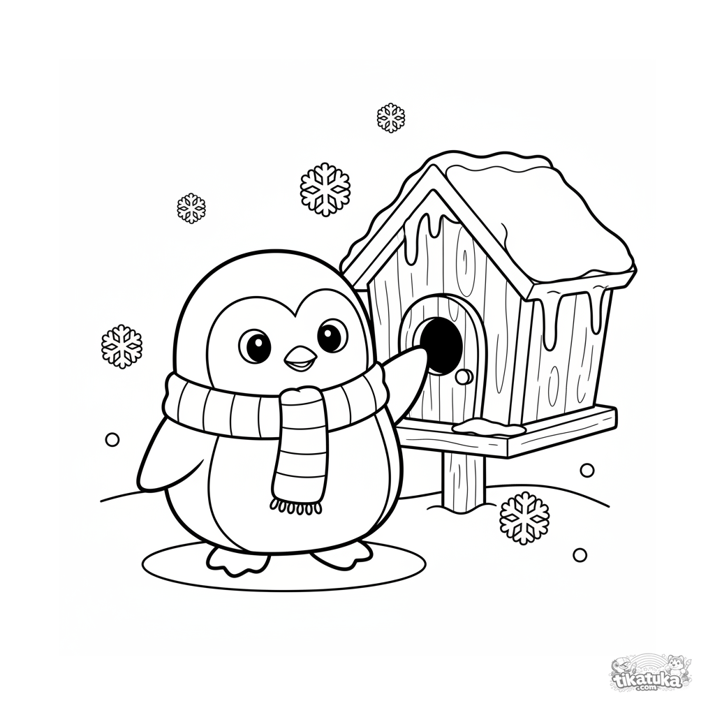 Página para colorear de invierno simple para bebés 2-3: un pingüino con bufanda parado en la puerta de una pajarera nevada. Formas grandes y amigables, pocos detalles, escena acogedora.