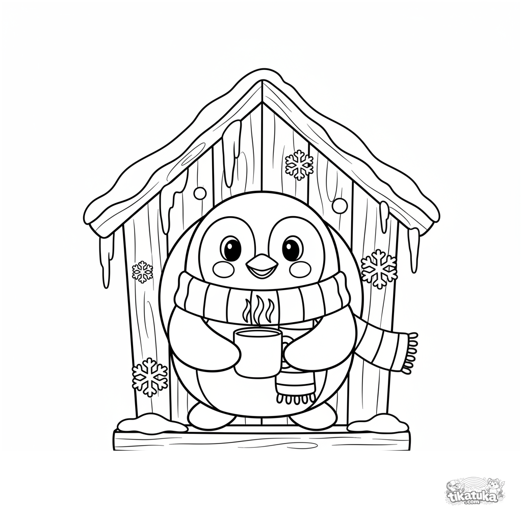 Página simple para colorear para niños pequeños 2-3: un pingüino de peluche con bufanda asoma por una casa de pájaros nevada, sosteniendo una taza.