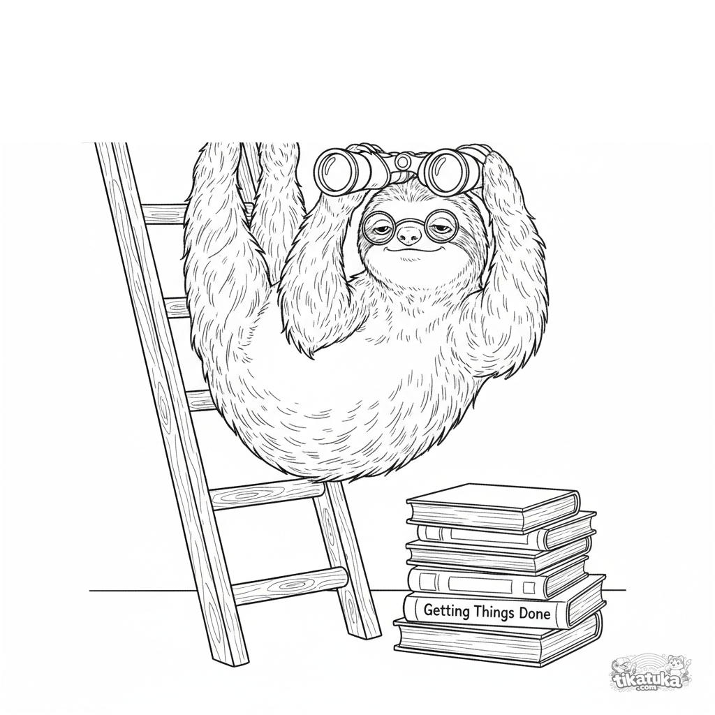 Página para colorear para niños 10-12: un perezoso filosófico con gafas cuelga de una escalera de biblioteca, mirando un libro de economía con prismáticos.