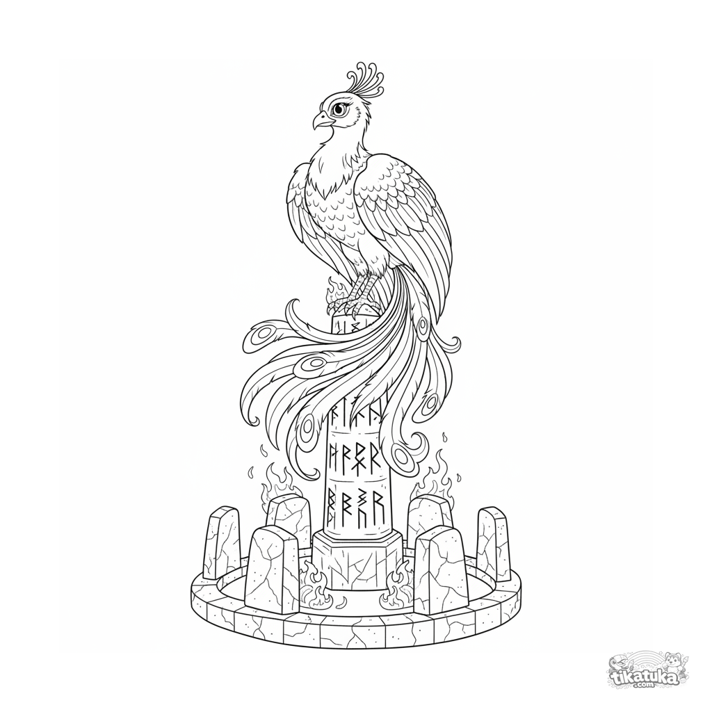 Página para colorear intrincada para niños mayores 10-12: un majestuoso fénix guardián sobre un obelisco rúnico dentro de un círculo de piedras. Plumas, llamas y símbolos antiguos detallados.