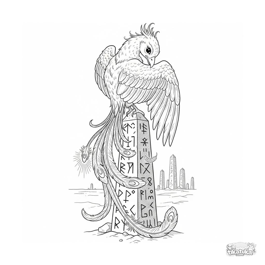 Página para colorear detallada estilo grabado para 10-12 años: un fénix juvenil se acicala en lo alto de un obelisco rúnico. Patrones intrincados, detalles de sombreado cruzado.