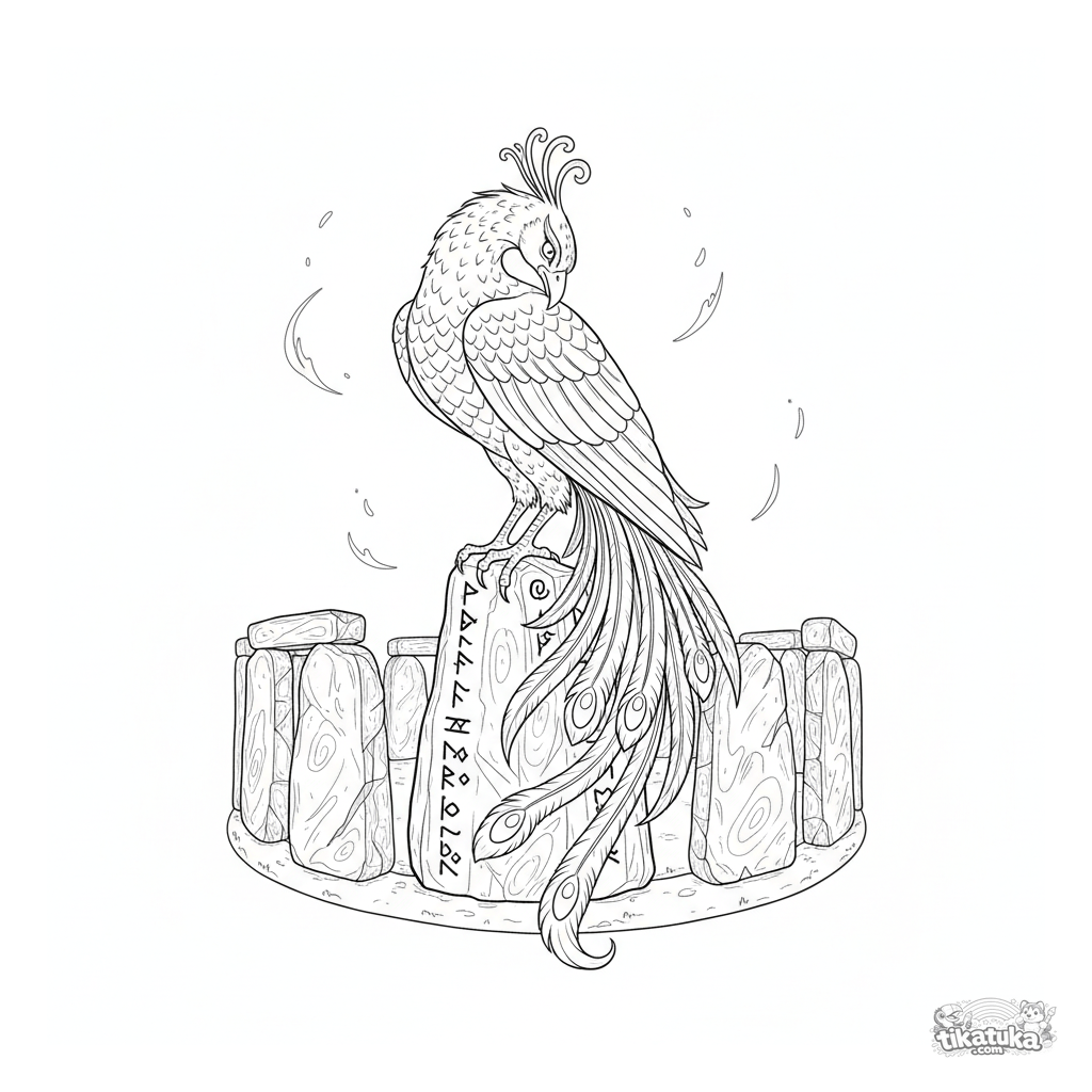 Página para colorear detallada para niños mayores de 10-12 años: un majestuoso fénix descansa en la cima de un antiguo monolito cubierto de runas. Trabajo de líneas intrincado, escena en capas, fondo rico para colorear creativamente.