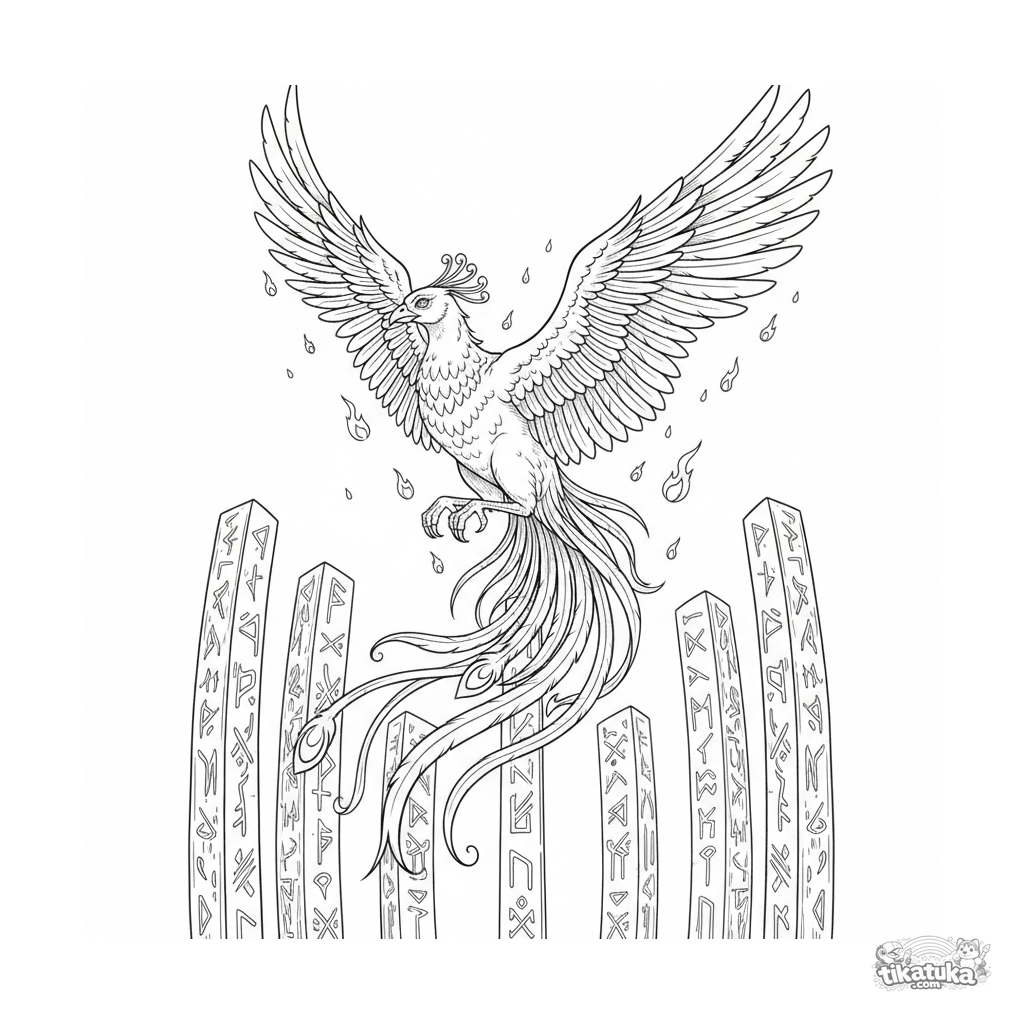 Página para colorear compleja para niños de 10-12 años: un majestuoso fénix se eleva desde el centro de un círculo de monolitos rúnicos antiguos. Plumas detalladas y composición dinámica.