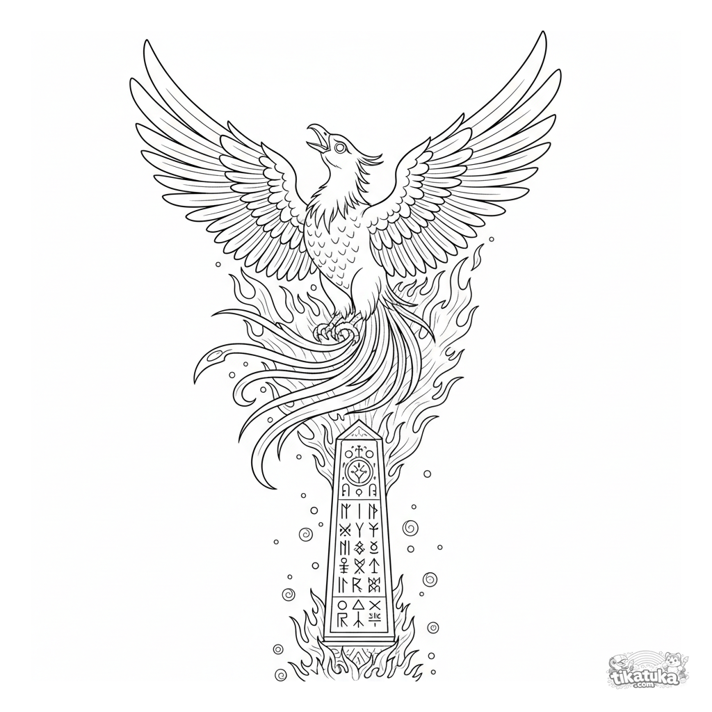 Página para colorear detallada para niños mayores de 10-12 años: un majestuoso fénix surge de un antiguo obelisco rúnico en un estallido de llamas estilizadas. Detalle intrincado en plumas y tallas.
