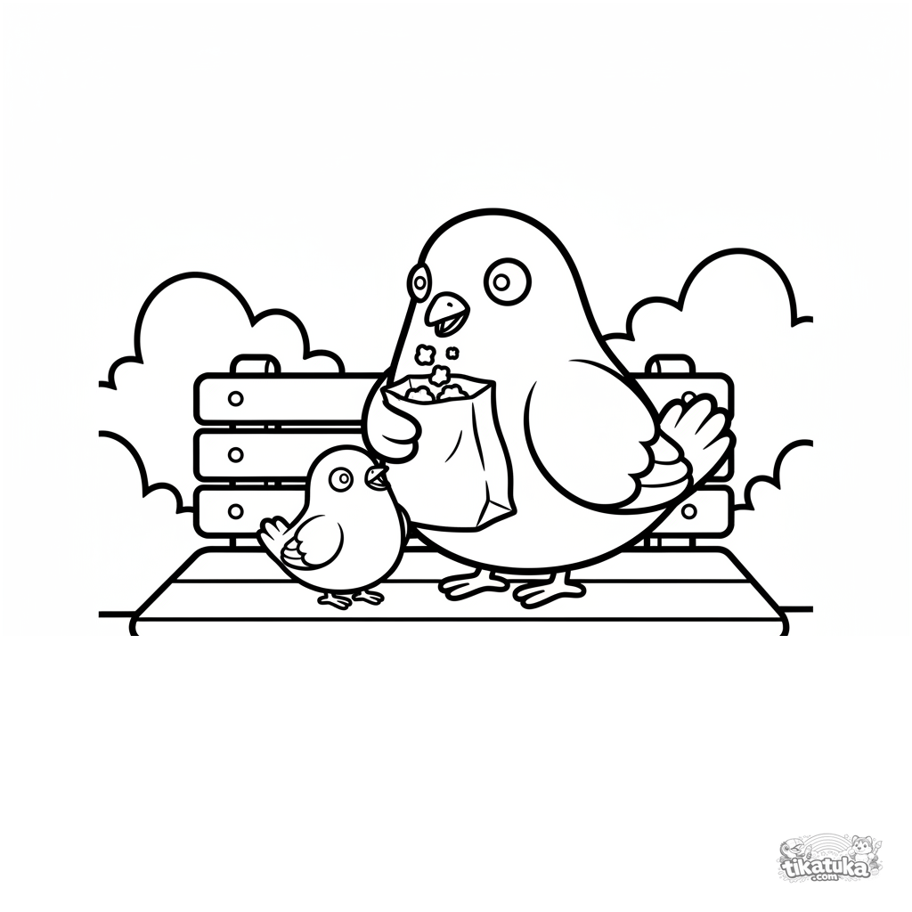 Página muy simple para colorear para bebés 2-3: una familia de palomas en un picnic en un banco. Formas enormes, sin fondo.